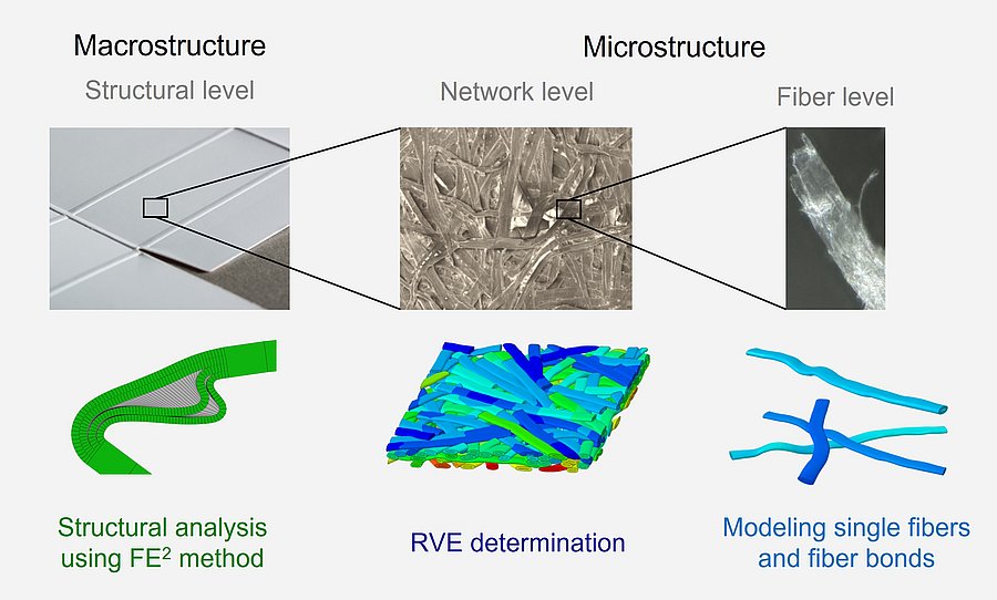 Nevertheless, even though paper has been produced and improved in industrial processes over decades, suitable simulation tools for structural calculations are still lacking. One reason for this is that the structural behavior is determined by complex mechanisms on the microstructure. Therefore, the goal of this project is to provide the transfer between macro- and microstructure. A numerical modeling strategy will be developed that provides an efficient prediction of the material behavior on the structural level as well as being able to represent microstructural effects.
